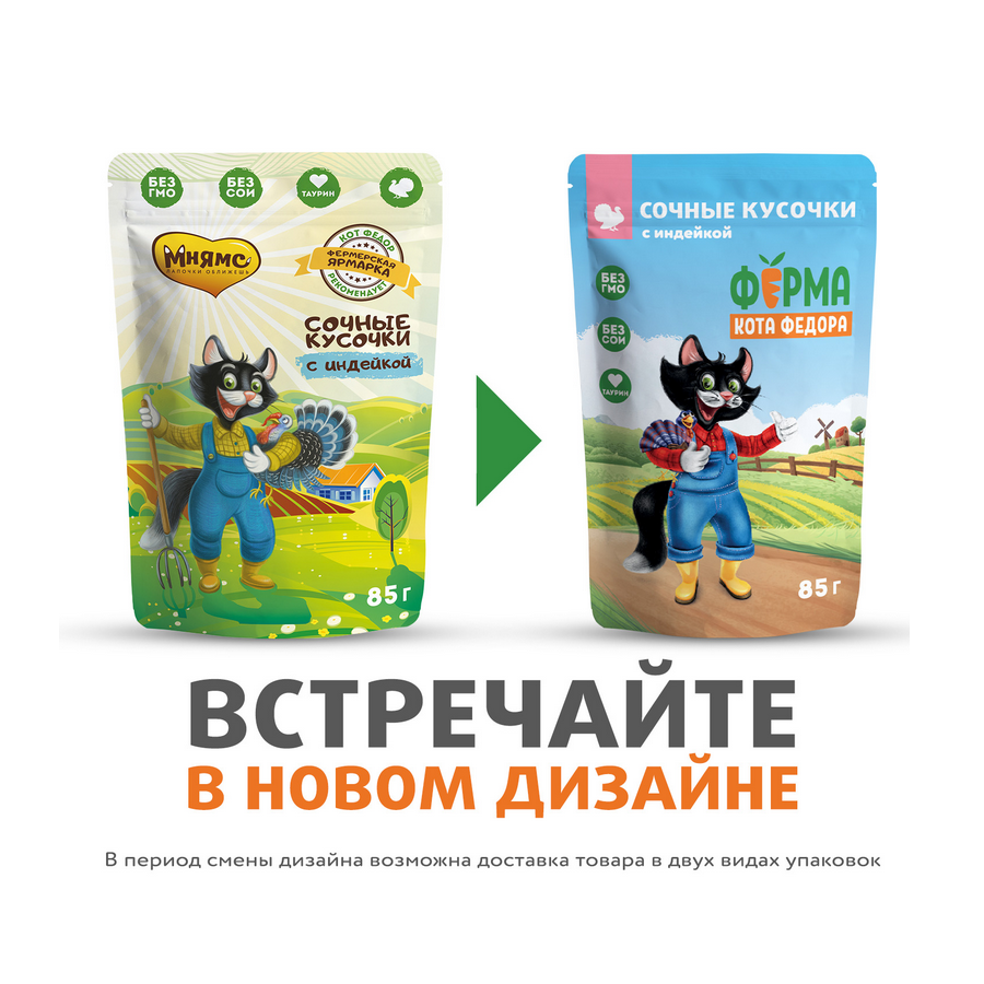 Мнямс сочные кусочки для кошек с индейкой «Фермерская ярмарка» линия Кот Федор 85г х 24 шт.
