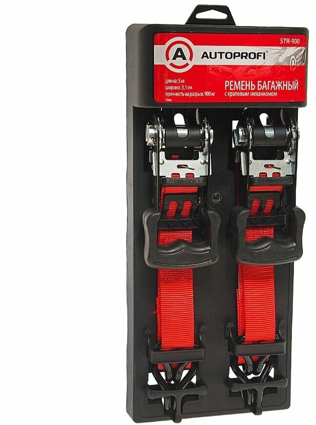 Ремень багажный AUTOPROFI STR-900, с храповым механизмом, 3,17см./5м., прочность на разрыв 900кг., 2шт.