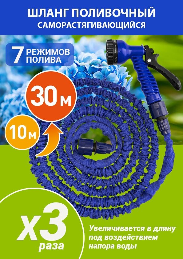 Шланг поливочный саморастягивающийся от 10м до 30м "Зеленый луг" ЗЛ-34/30 с распылителем синий