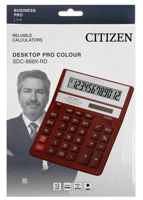 Калькулятор настольный Citizen полноразмерный, бухгалтерский, 12 разрядов, бордовый (SDC-888XRD)