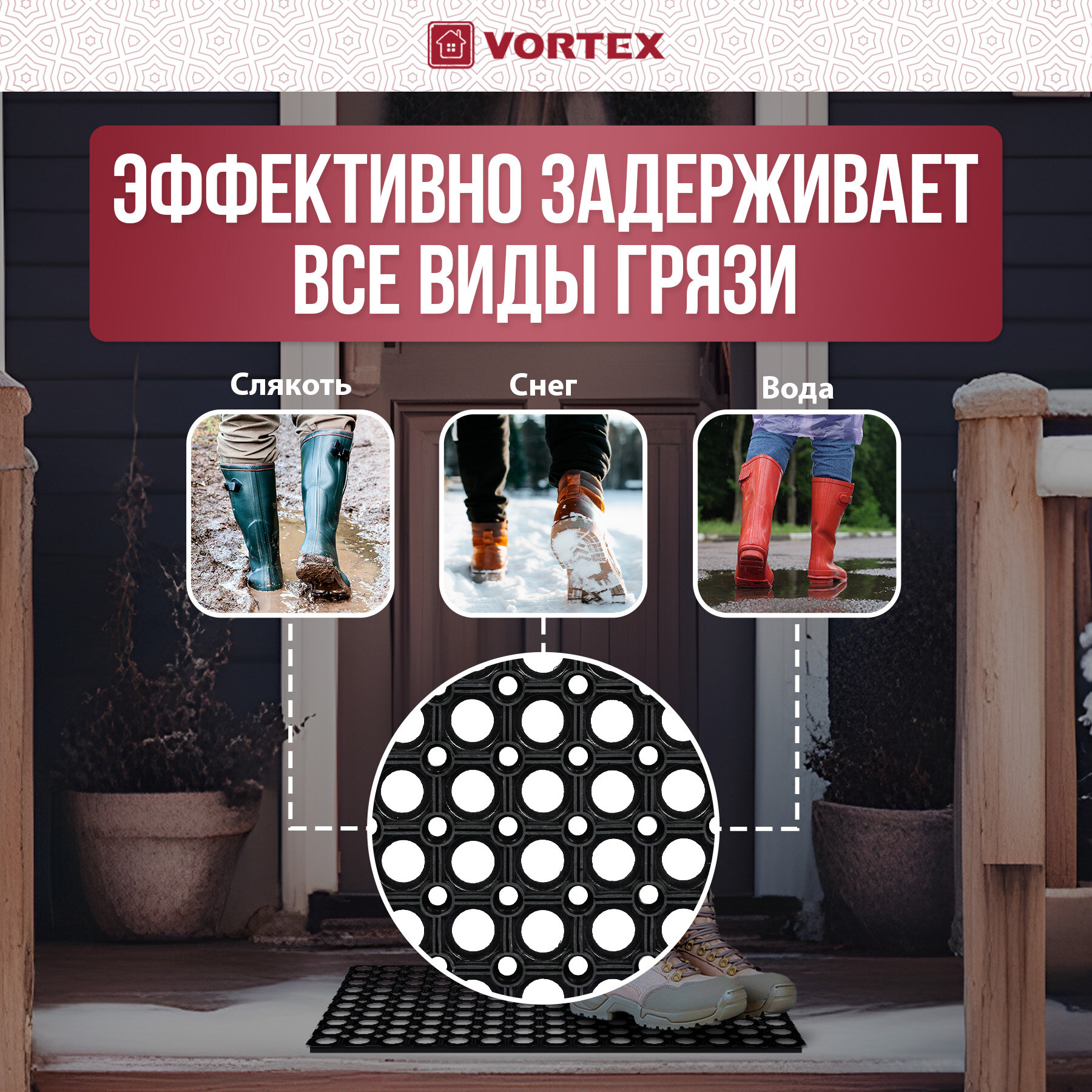 Коврик входной Vortex резиновый крупноячеистый грязезащитный 50х100 см, толщина 22 мм, черный