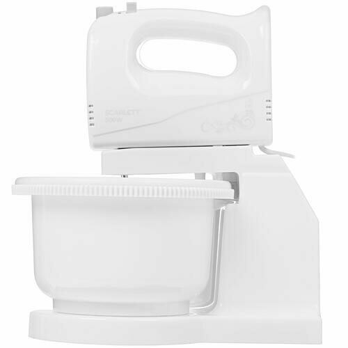 Миксер SCARLETT SC-HM40B03 на подставке 500 Вт, 5 скоростей, 2 венчика, 2 крюка для теста, чаша, белый