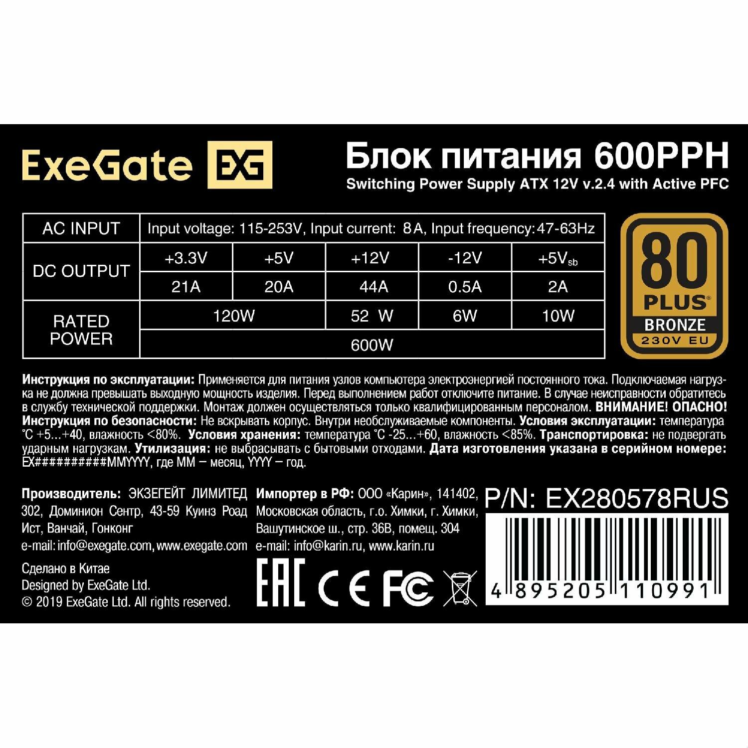 Блок питания EXEGATE 600PPH, 600Вт, 120мм, черный, retail [ex280578rus-s]