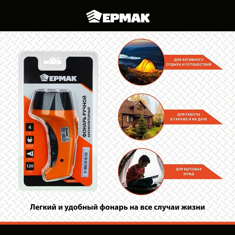 Ермак Фонарь аккумуляторный 4 ярк. LED, вилка 220В, пластик, 13x5,3 см