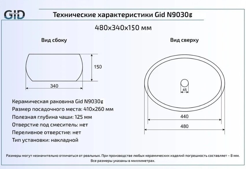 Накладная раковина для ванной Gid 9030G