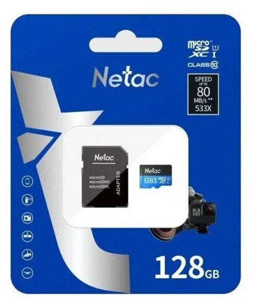MicroSD 128 Гб Netac P500 Standard UHS-I (90 Mb/s) + SD адаптер (Class 10)