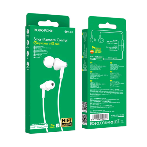 Наушники внутриканальные Borofone BM49, Player, кнопка ответа, кабель 1.2м, цвет: белый