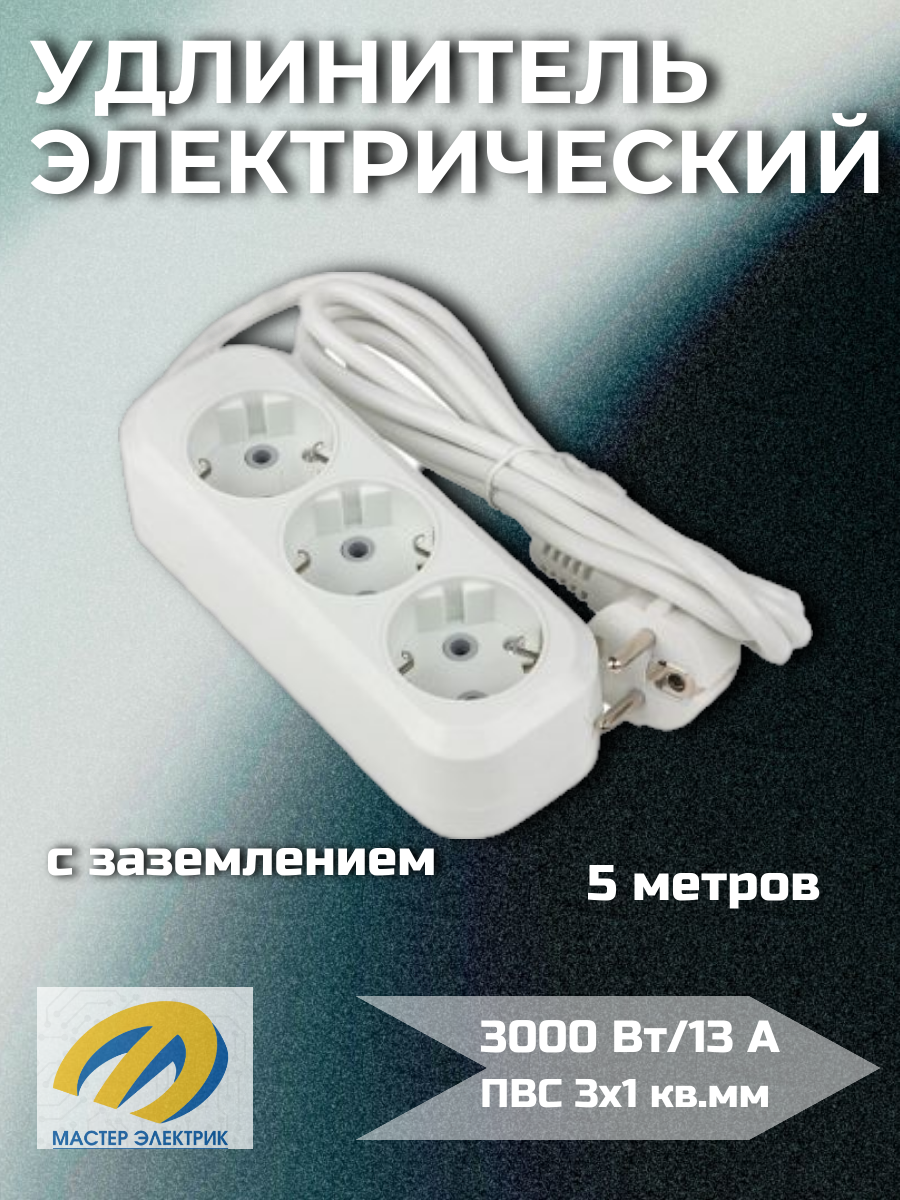 Удлинитель бытовой с заземлением, 3 розетки, 5 метров, Эксперт (16А-3,5кВт, ПВС)