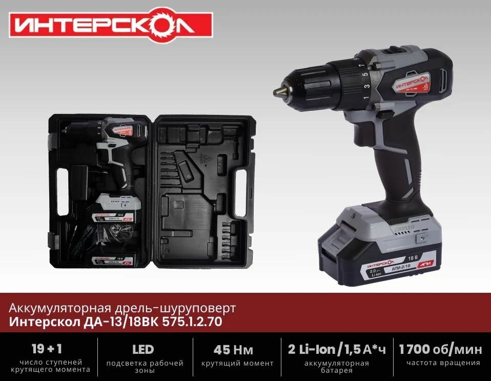 Дрель-шуруповерт Интерскол ДА-13/18ВК 45 аккум. патрон:быстрозажимной (кейс в комплекте) (575.0.0.70)