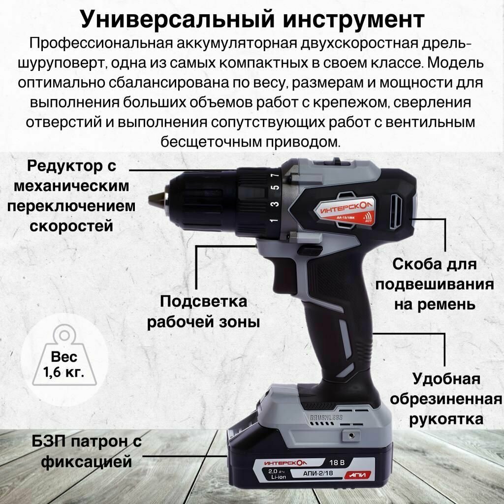 Бесщеточная аккумуляторная дрель-шуруповерт ИНТЕРСКОЛ ДА-13/18ВК 575.0.0.70, кейс, АПИ, без АКБ и ЗУ