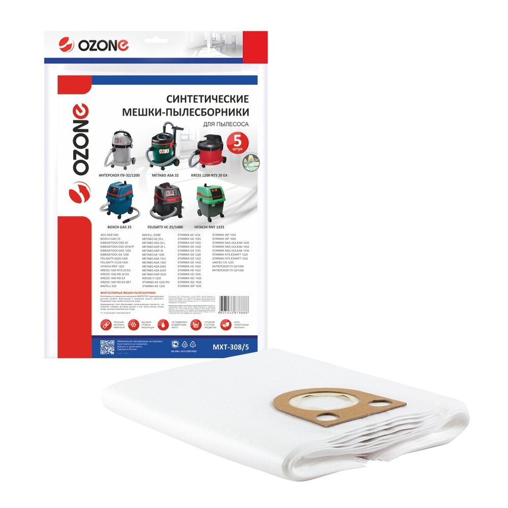 Ozone Мешки для пылесоса BOSCH GAS 25, KRESS 1400, ИНТЕРСКОЛ ПУ-32/1200, STARMIX FB20/25/35, AEG, FELISATTI, HITACHI, METABO, 5 шт., синтетические, не боятся мокрой пыли, Ozone MXT-308/5