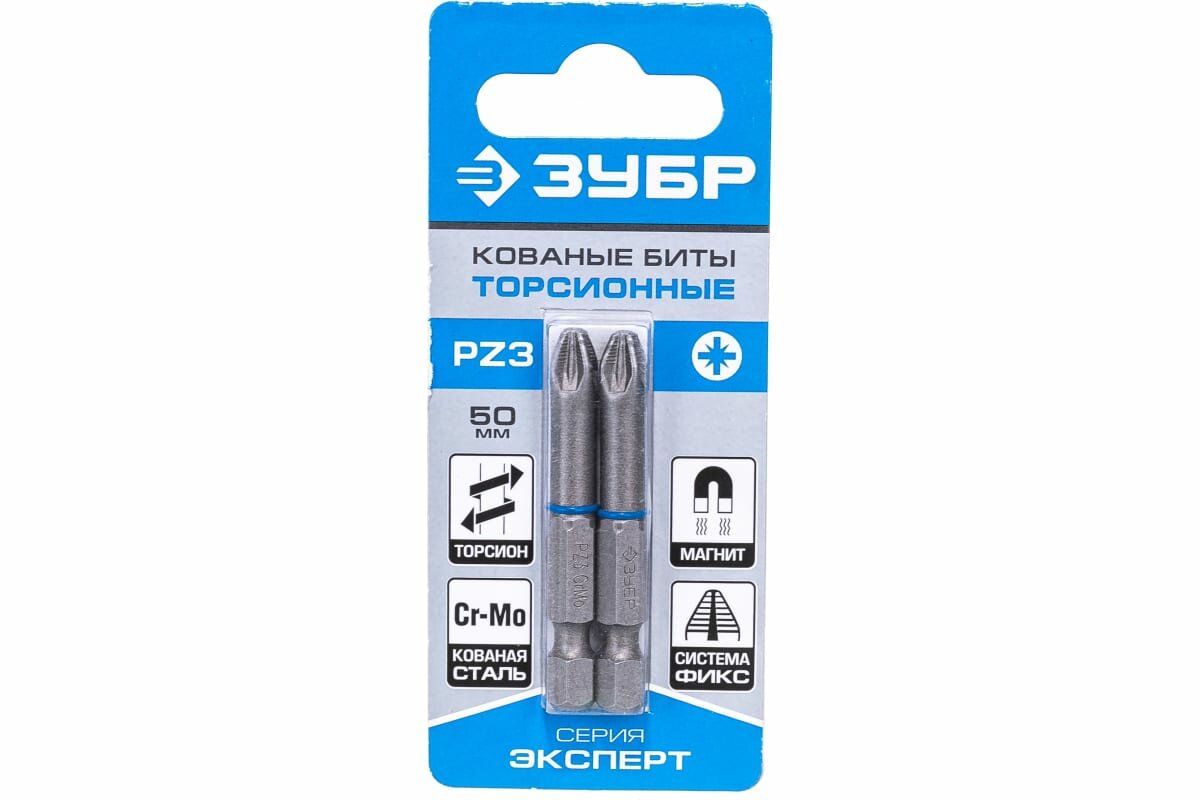 Биты ЗУБР эксперт торсионные кованые, обточенные, хромомолибденовая сталь, тип хвостовика E 1/4, PZ3, 50мм, 2шт