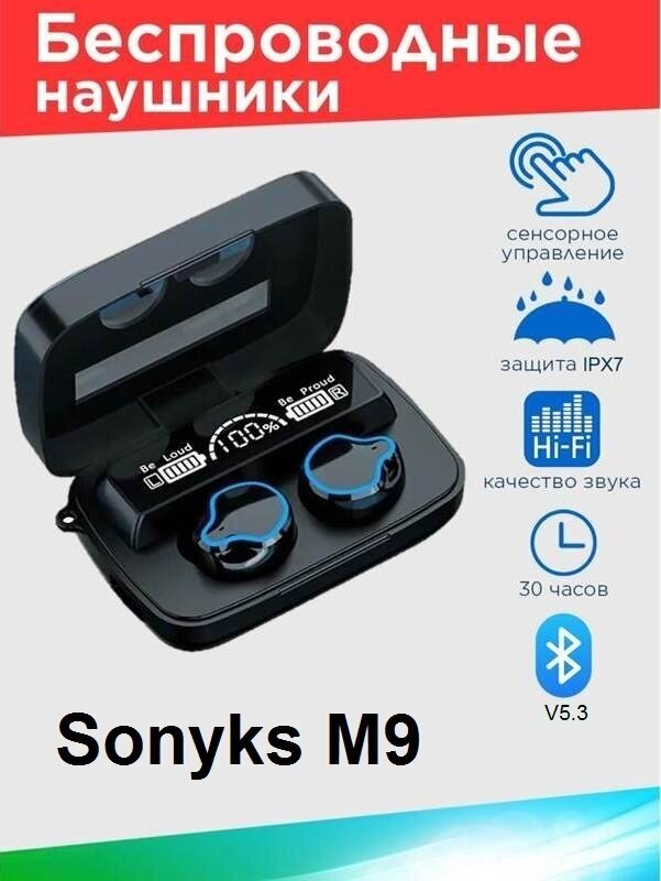 "Беспроводные наушники Sonyks M9 с Power bank 2000 мАч, фонарик, зеркало, Bluetooth V5.3, с сенсорным управлением, черные"