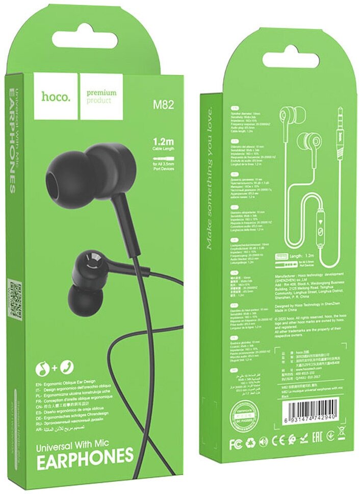 Купить Наушники внутриканальные HOCO M82, микрофон, 1,2 метра, черный