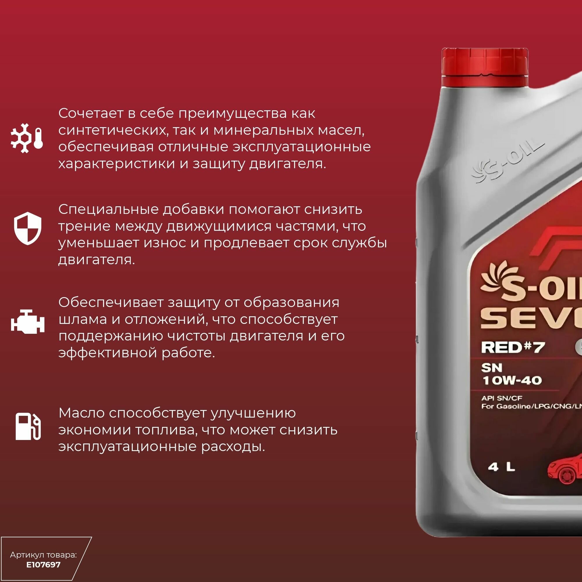 СохранитьПолусинтетическое моторное масло S-OIL SEVEN RED #7 SN 10W-40, 4 л интересное: