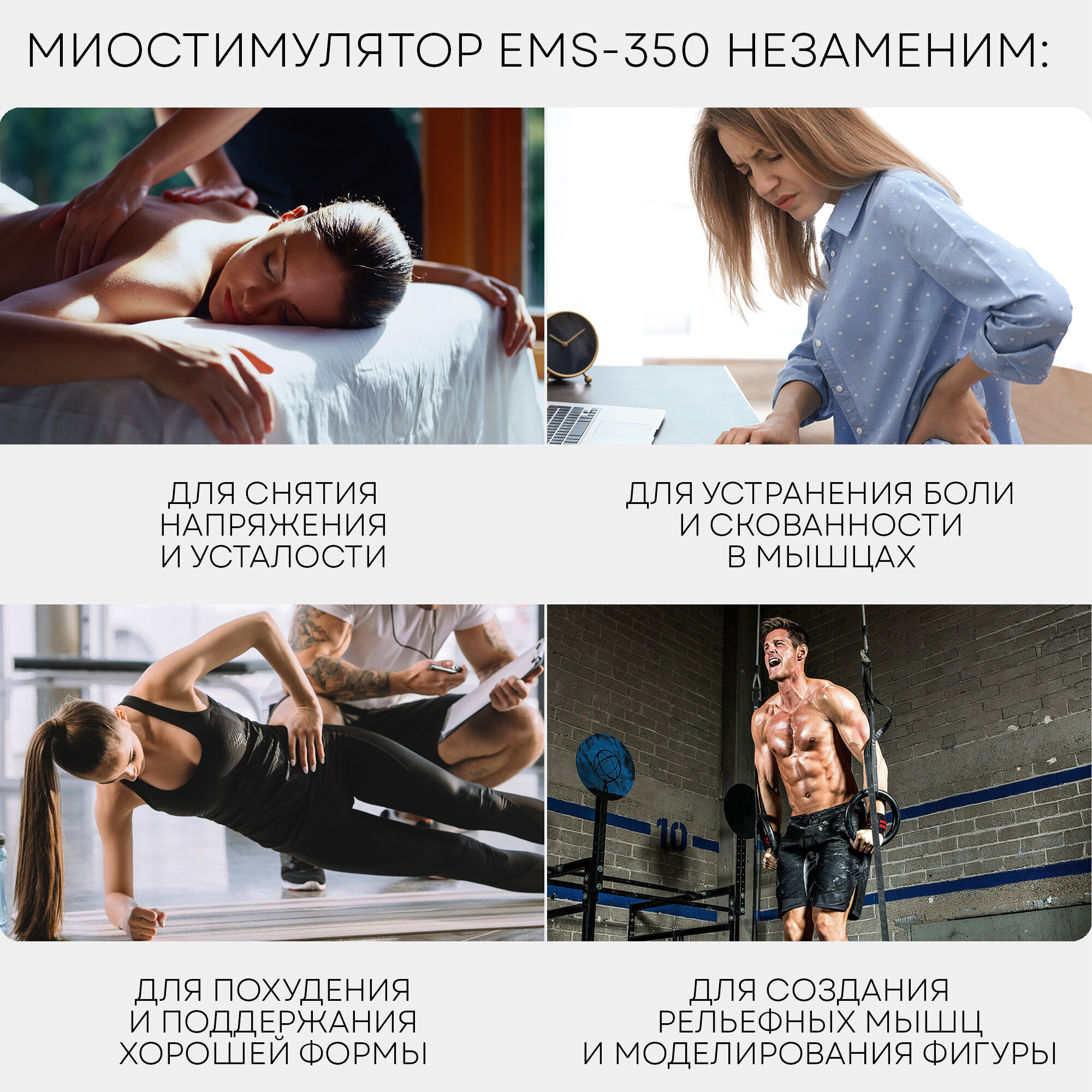 PLANTA Массажер для тела миостимулятор тренажер мышц EMS+TENS EMS-350, 4 канала, 8 электродов, 12 режимов интересное: