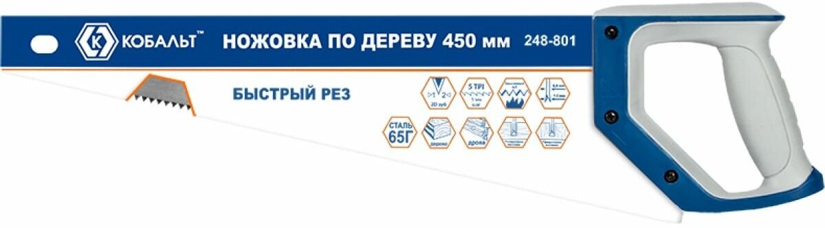 Ножовка по дереву Кобальт Ножовка по дереву 450 мм, шаг 5 мм/ 5 TPI, закаленный зуб,2D-заточка, двухкомпонентная рукоятка, б