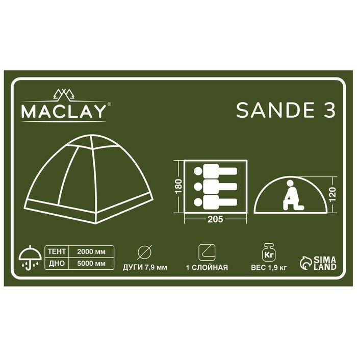 Maclay Палатка туристическая SANDE 3, размер 205 х 180 х 120 см, 3-местная, однослойная