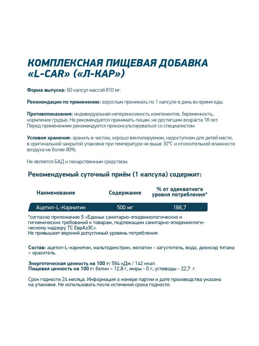 | Дополнительная информация | состав: ацетил-L-карнитин, мальтодекстрин, желатин - загуститель, вода, диоксид титана – краситель; рекомендации по применению: принимать по 1 капсуле в день во время еды; энергетическая ценность на 100 г: 142 ккал, пищевая ценность; белки – 12,8 г, жиры - 0 г, углеводы - 22,7 г |