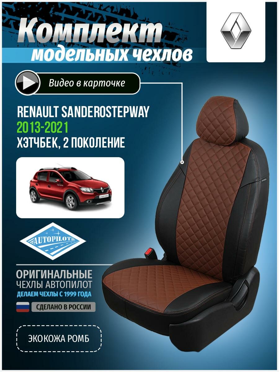 Авточехлы для Renault Logan, Sandero Stepway 2 2013-2020 Автопилот Коричневый Экокожа с ромбом re-sd-s14-cheko-r
