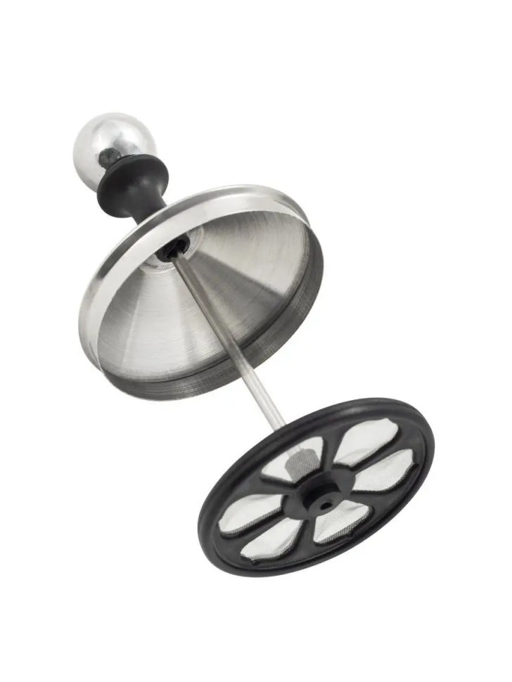 | Минусы: | Поршень пластиковый с пластиковой сеткой одноуровневый. Двойной сетки я не увидела. Шкалы внутри нет. |
