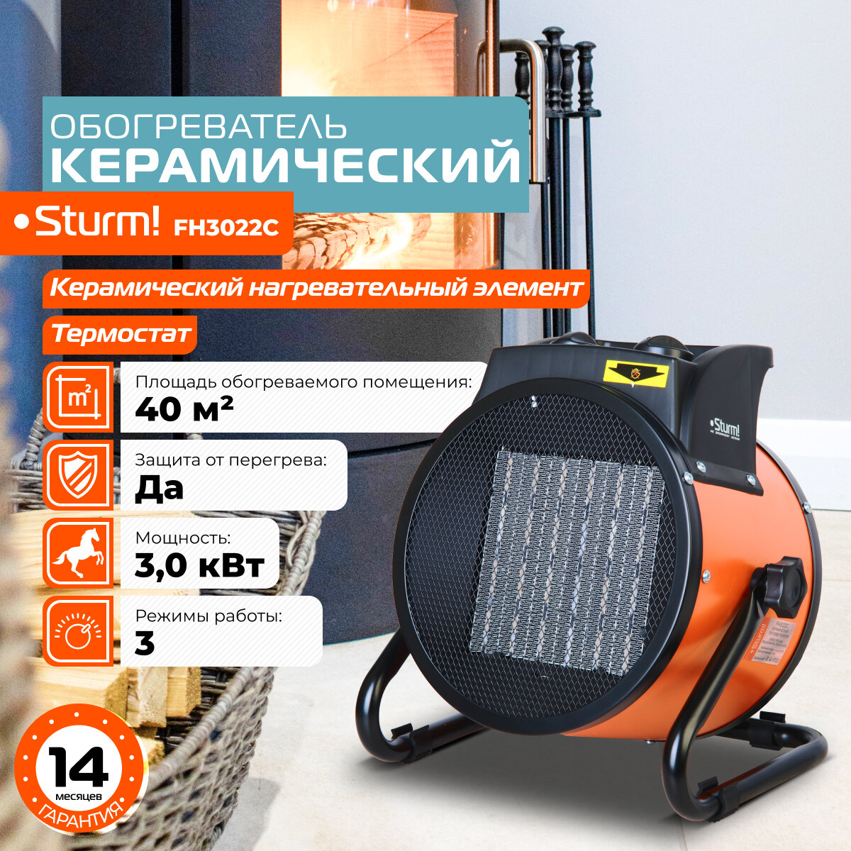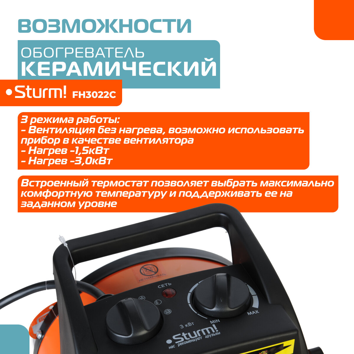 FH3022C Тепловентилятор керамич. Sturm, 3кВт, 2 реж:1.5/3 кВт, термостат, защит.от перегрева