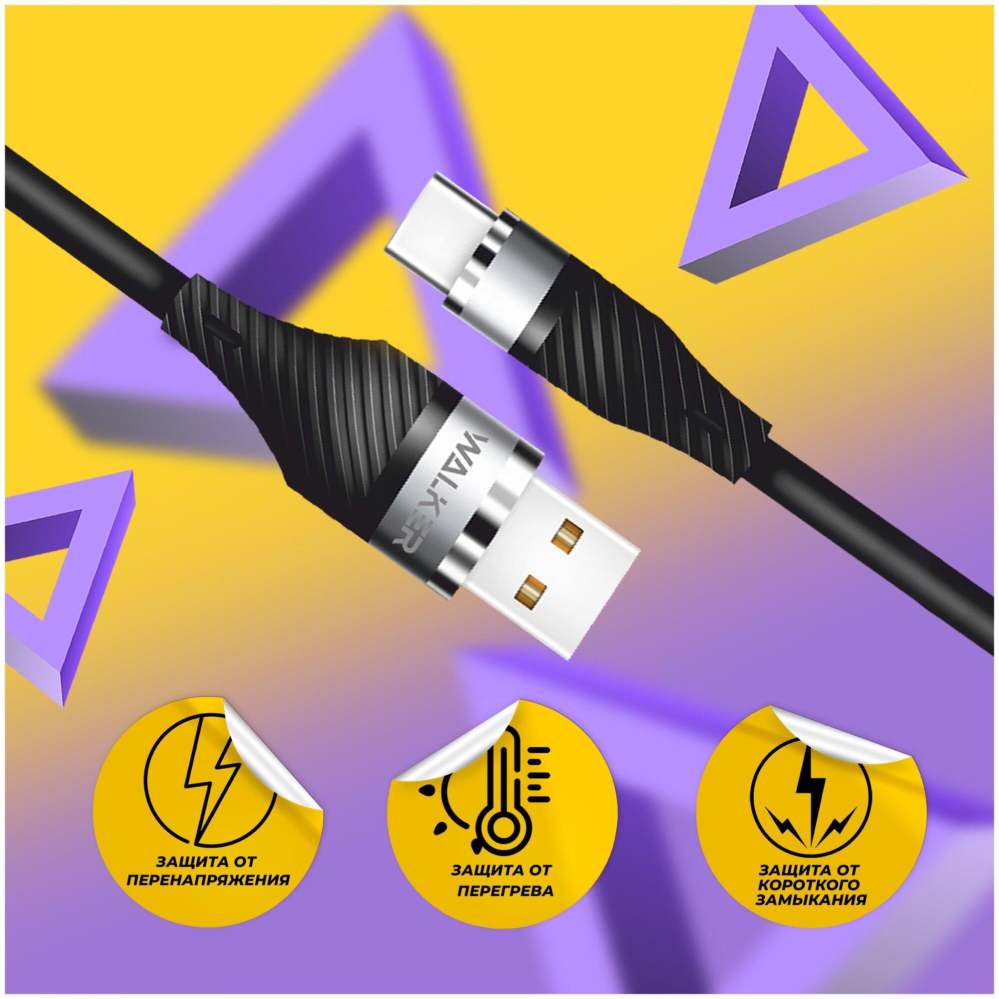 Кабель для зарядки Type-C - USB WALKER C735, 3.1 А, быстрый заряд, 2 м, силиконовая оплетка, черный / шнур usb питания для телефона android