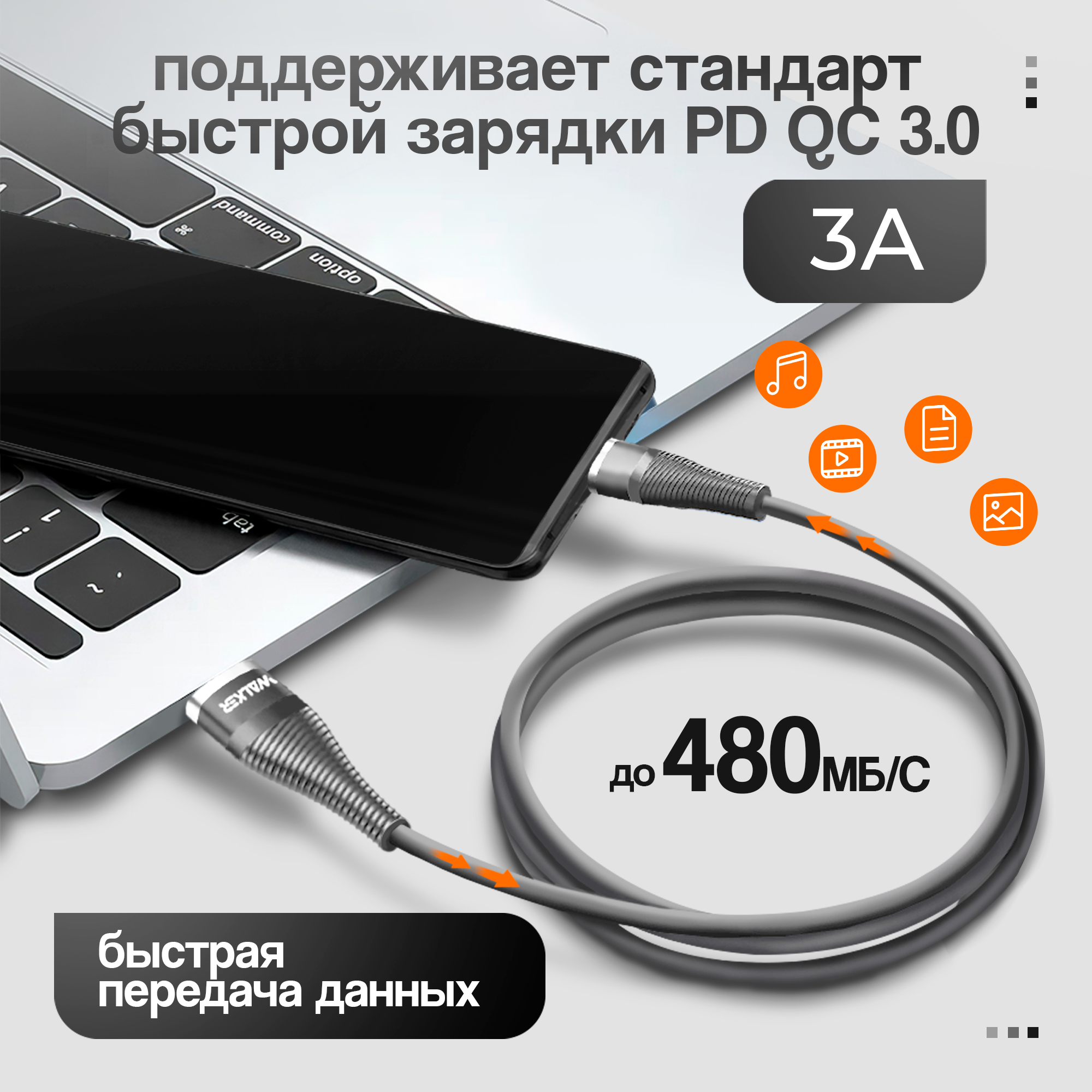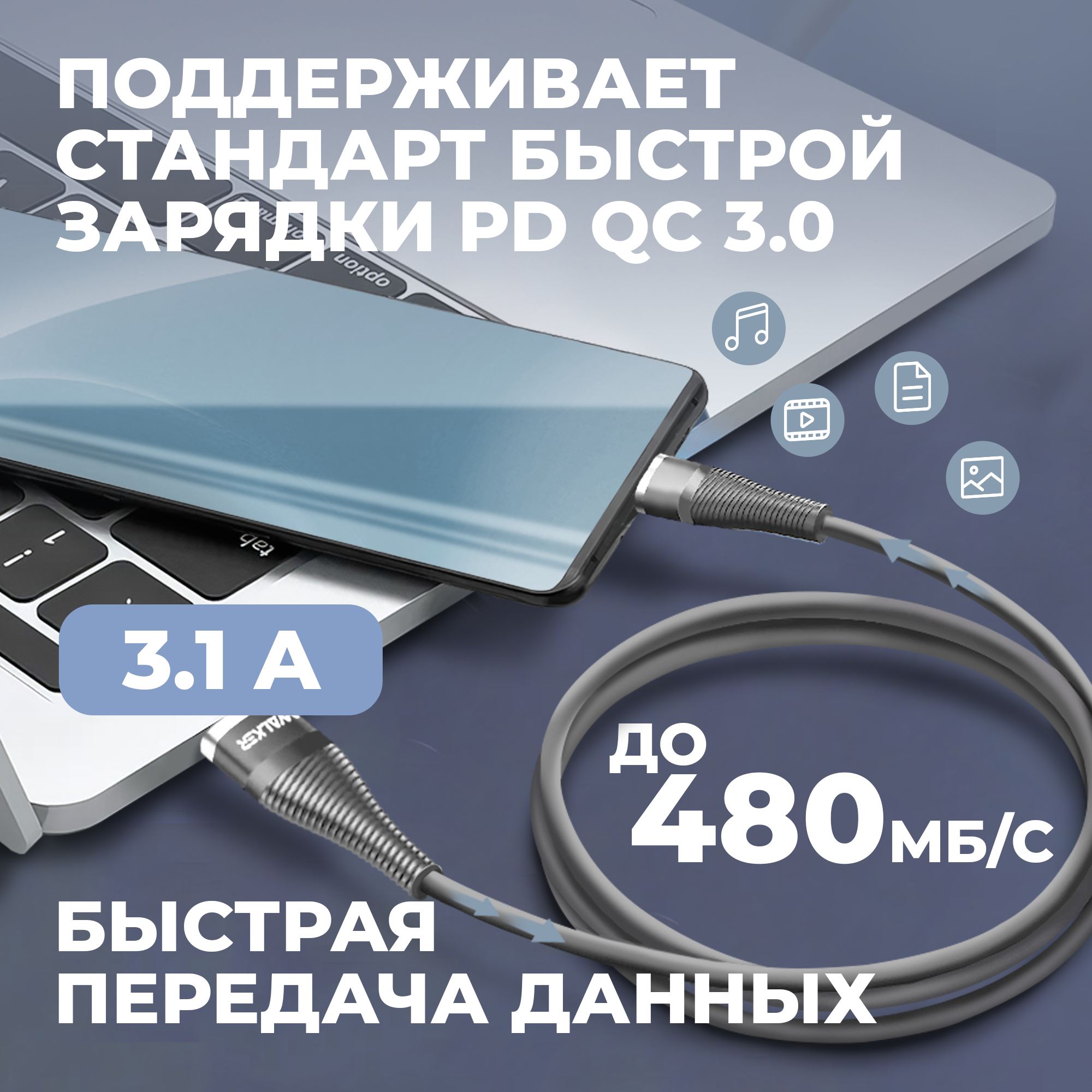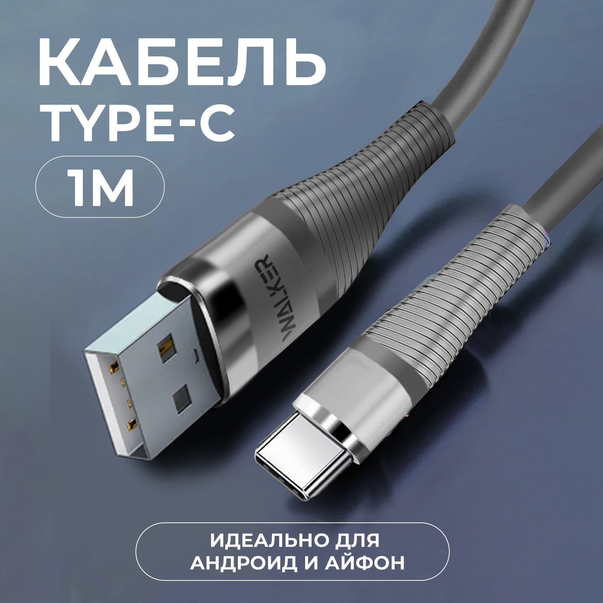Кабель для зарядки Type-C - USB WALKER C735, 3.1 А, быстрый заряд, 1 м, силиконовая оплетка, серый / шнур usb питания для телефона android