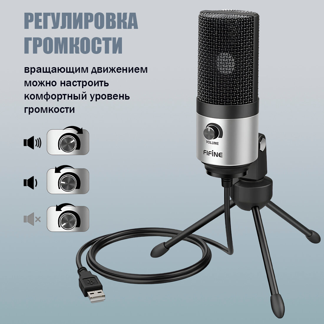 Микрофон FIFINE K669 (чёрный, на штативе, USB 5V, 20Hz-20kHz, -34dB±30% (1kHz), S/N 78dB, шнур 1.8 м, рег. громкости)