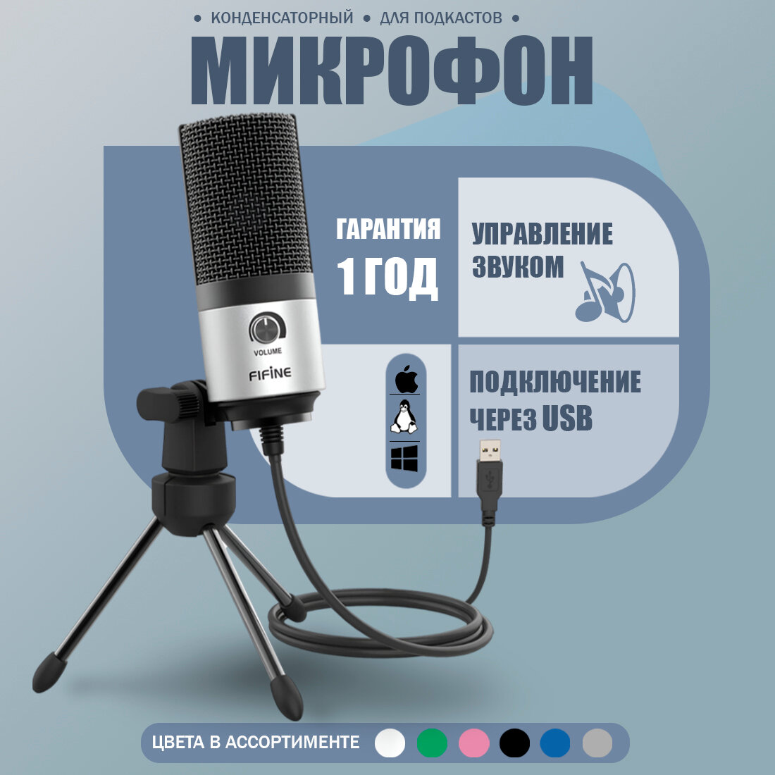 Конденсаторный студийный USB-микрофон Fifine K669 (компьютерный, игровой, для стримов, для конференций, Blue)