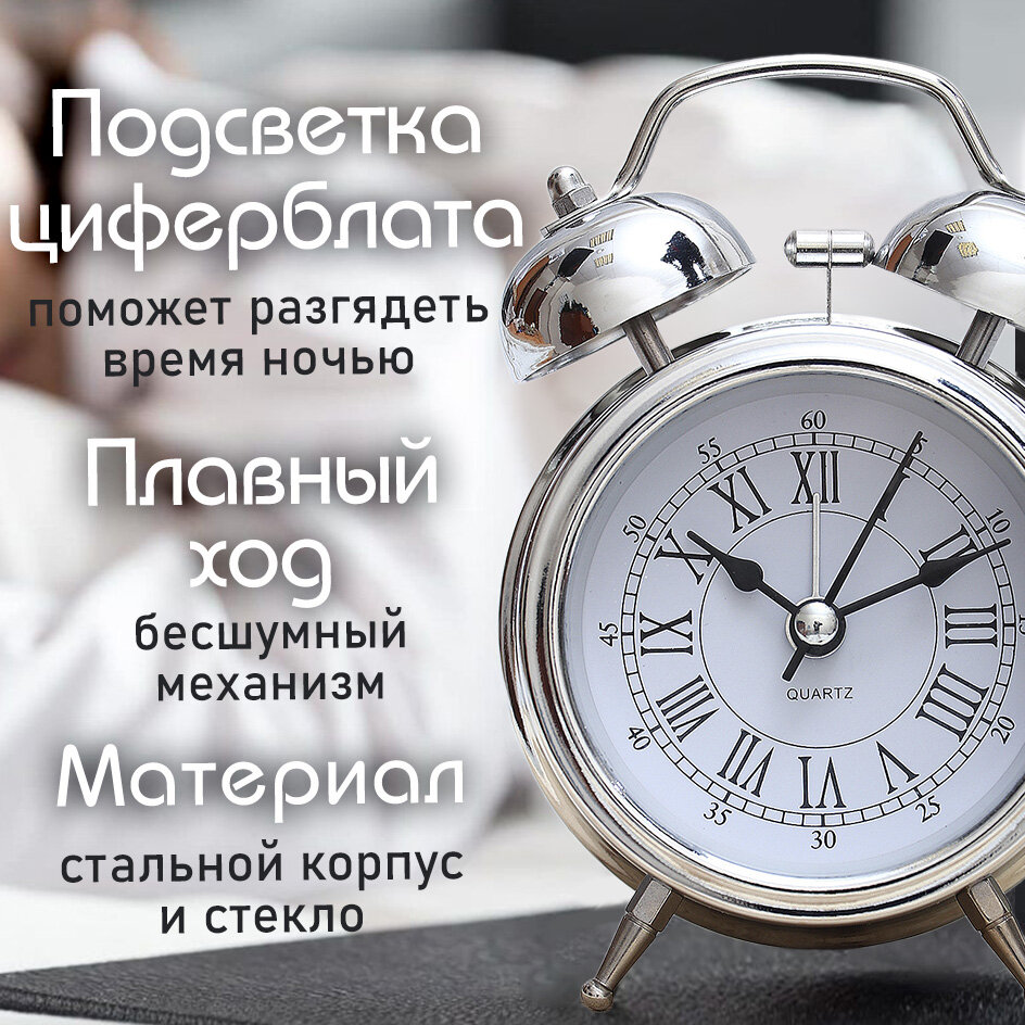 Часы будильник настольные классические D-10 см цвет хром Эврика детские, взрослые, подарочные мужские, женщине, ребенку, на стол, в спальню
