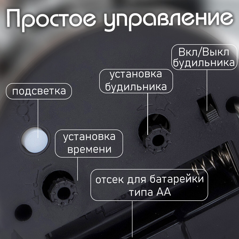Часы будильник металл Кругляш черные классические настольные подарок женщине на 8 марта, мужчине на 23 февраля, ребенку