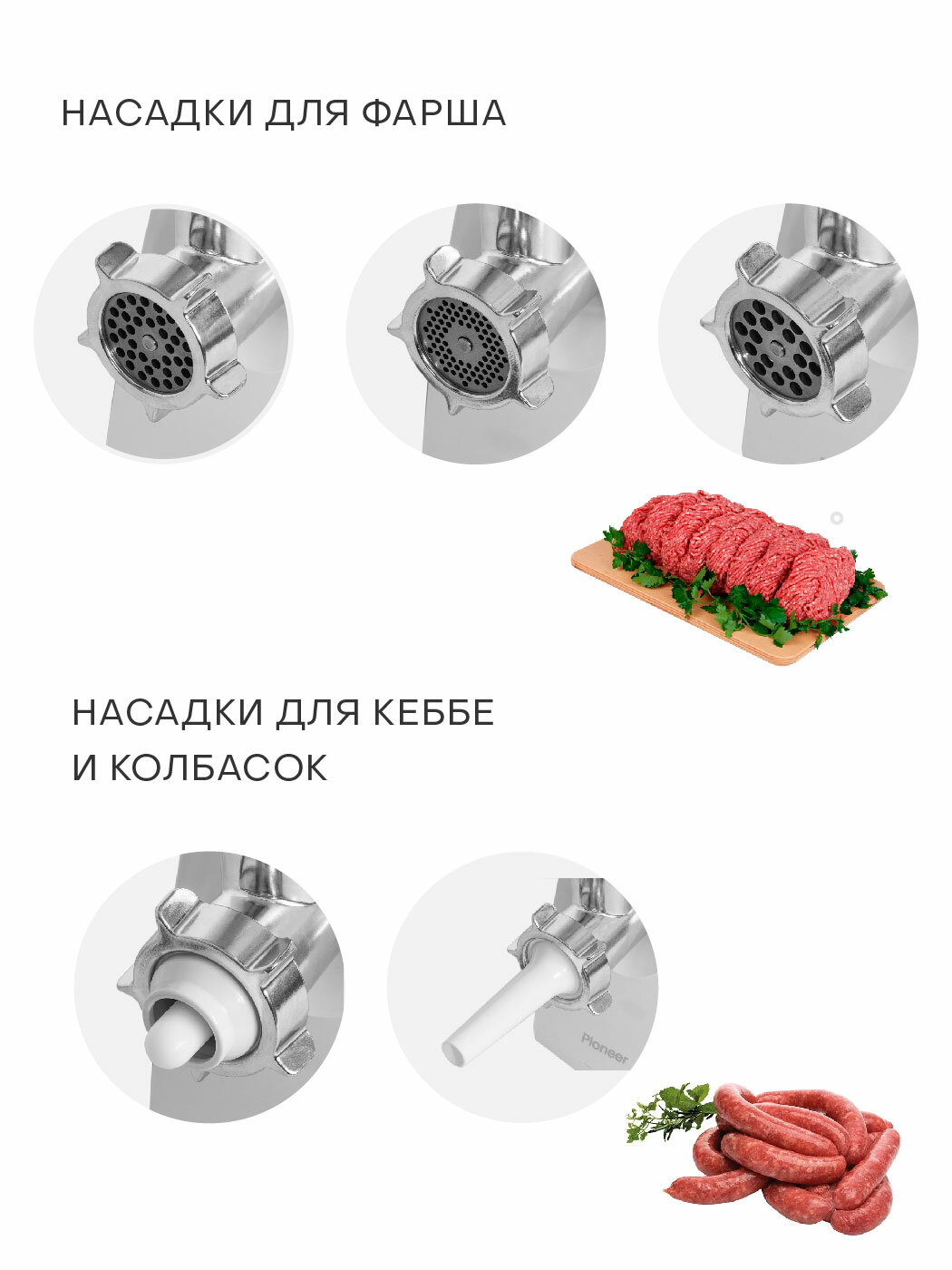 Мясорубка Pioneer MG108 электрическая с подсветкой кнопок, реверсом, насадками для колбасок и кеббе, 1800 Вт