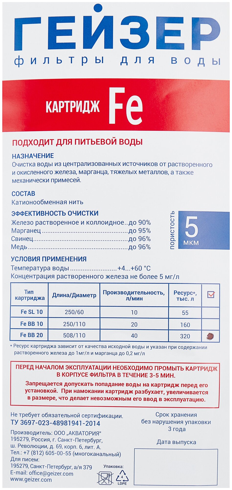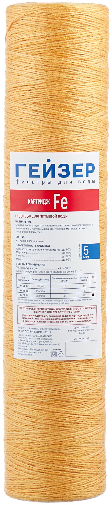Картридж фильтра для воды Fe-20BB обезжелезивающий Гейзер 28125