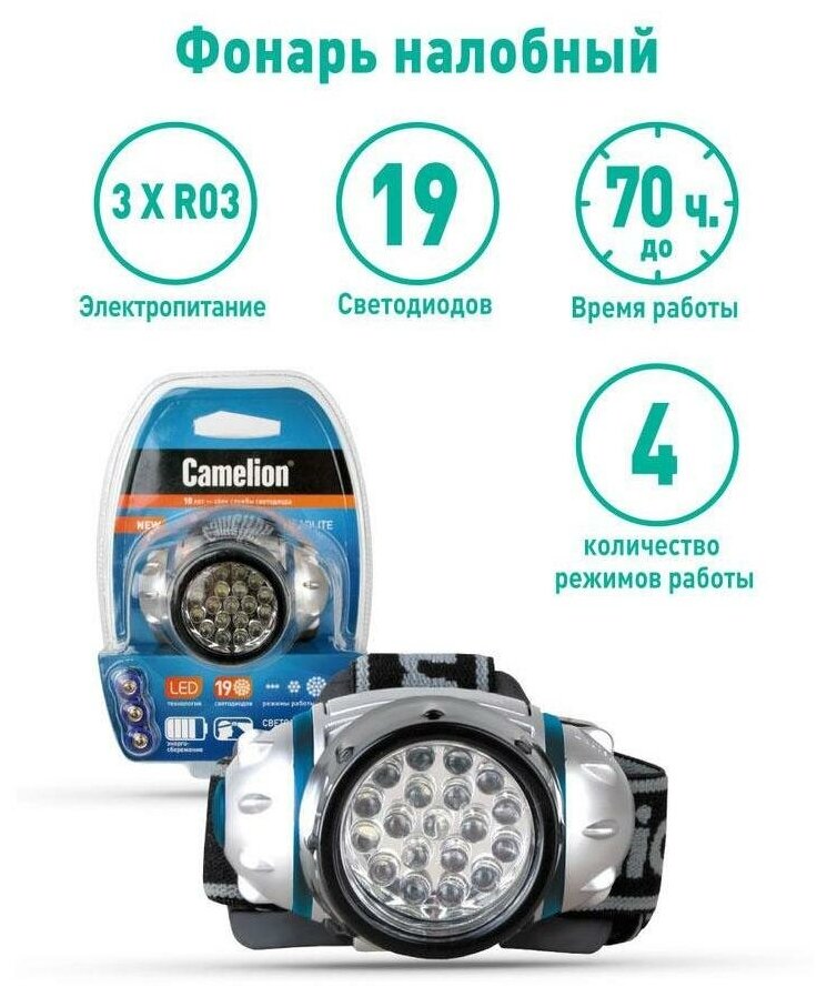 Фонарь Налобный Светодиодный 19led 4 Режима 3xr03 Блистер Camelion Headlite Led5313-19f4 Camelion арт. 7537