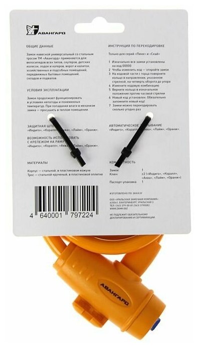Авангард ВС-Т10 (1000 мм) техно оранж замок навесной с тросом (d=10мм) длина 1м (велосипедный) (арт. 508062)