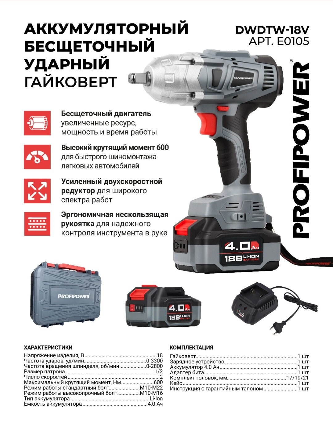 Аккумуляторный гайковерт бесщеточный ударный ProfiPower DWDTW-18V (Li-ion-1шт, 4.0Ач, 600Нм, ударная головка, З/У, в кейсе) интересное: