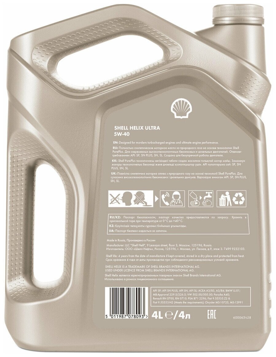Синтетическое моторное масло SHELL Helix Ultra 5W-40 SP, 4 л, 3.7 кг, 1 шт