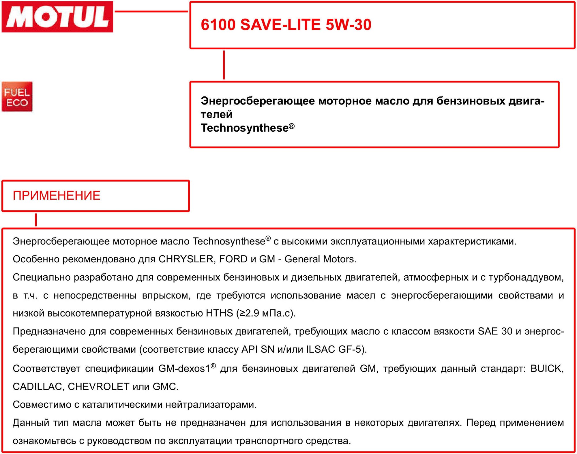 MOTUL 107957 Масло моторное MOTUL 5W30 (4L) 6100 SAVE-LITE Масло моторное \API SN/CF ILSAC GF-5