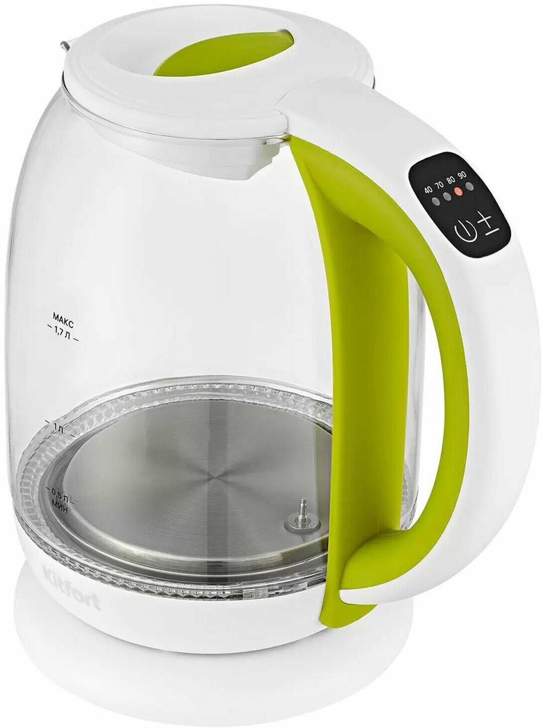 Чайник KITFORT КТ-6140-2, 1,7 л, 2200 Вт, закрытый нагревательный элемент, терморегулятор, стекло, белый, салатовый