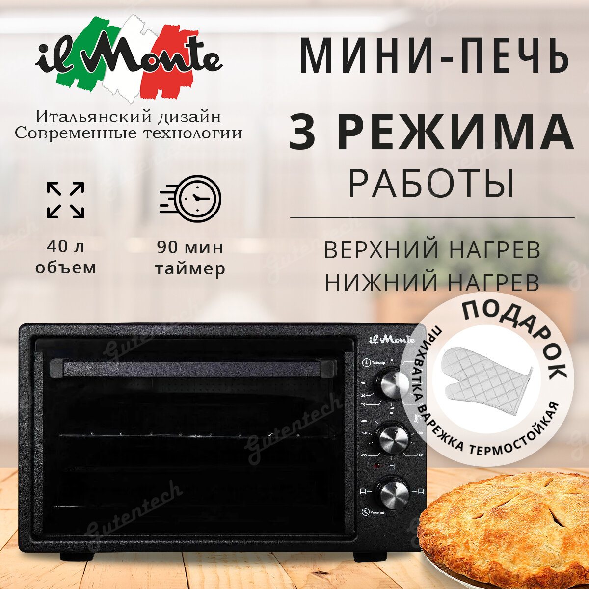 СохранитьМини печь электрическая духовка 40 л, 1400Вт, Нижний ТЭН закрыт, 3 режима, от 50 до 300 С. il Monte EO-4003 BLACK интересное: