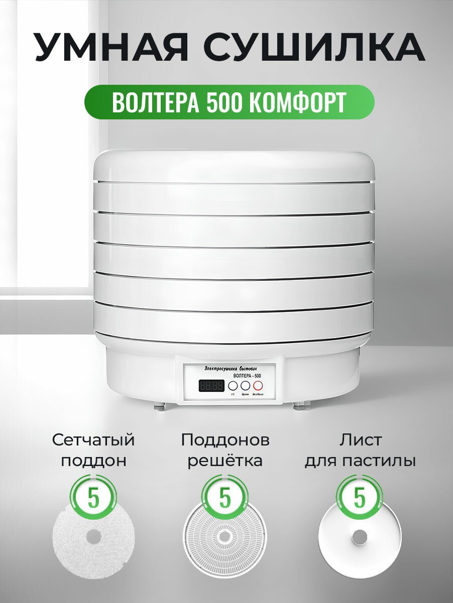 Сушилка ВолТера 500 Комфорт с таймером и симисторным блоком (с 5 решетчатыми, 5 сетчатыми и 5 поддонами для пастилы), белый