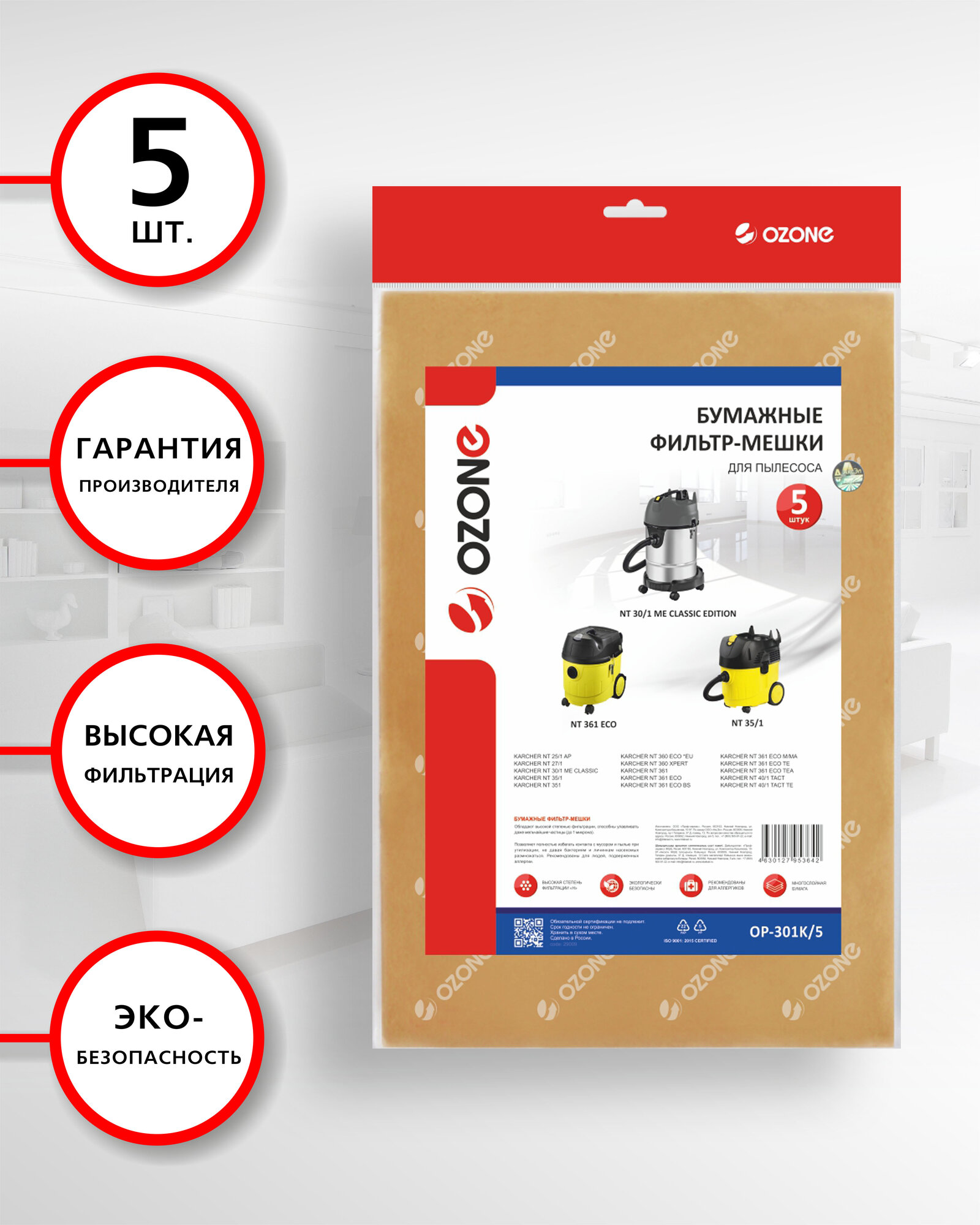 Мешок для пылесоса Ozone (OP-301K/5) 36 л к моделям MV 3/WD 4 бумага для сухой уборки (5 шт.) интересное: