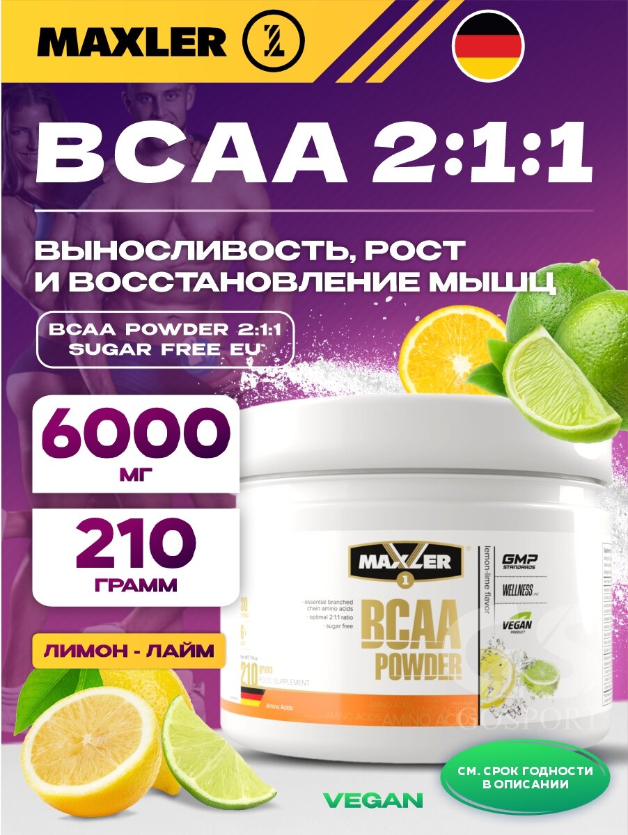 Аминокислоты Maxler BCAA Powder - Лимон-лайм, 210г - БЦАА в соотношении 2:1:1 - Отличная растворимость - Приятный вкус