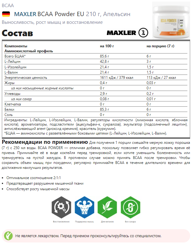 Ниже Вы можете прочитать отзывы на BCAA Maxler BCAA Powder EU, апельсин, 210 гр., ознакомится с подробными характеристиками, посмотреть интересные обзоры и фотографии на BCAA Maxler BCAA Powder EU, апельсин, 210 гр..