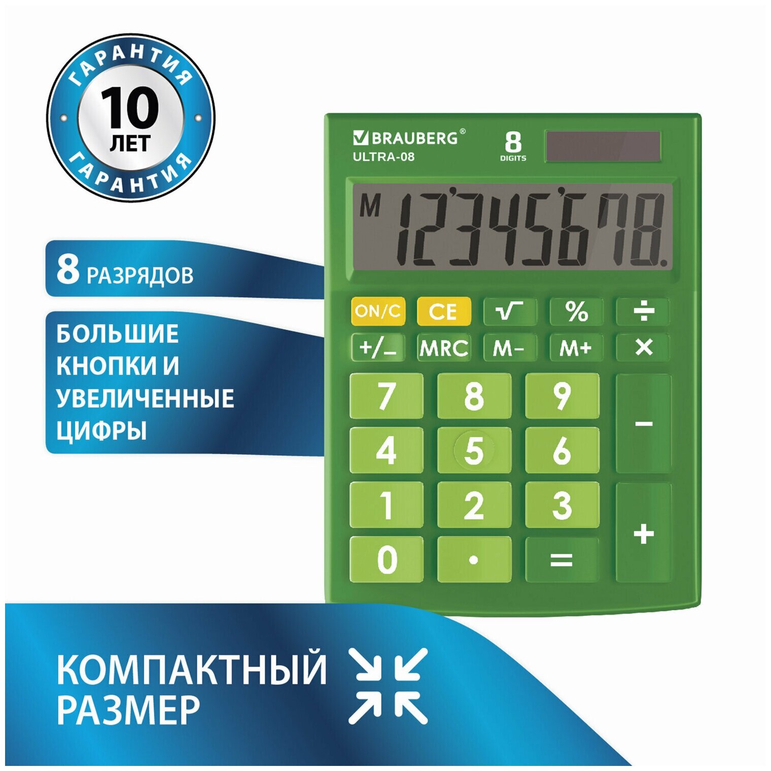 Калькулятор настольный BRAUBERG ULTRA - 08 - GN, компактный (154x115 мм), 8 разрядов, двойное питание, зеленый