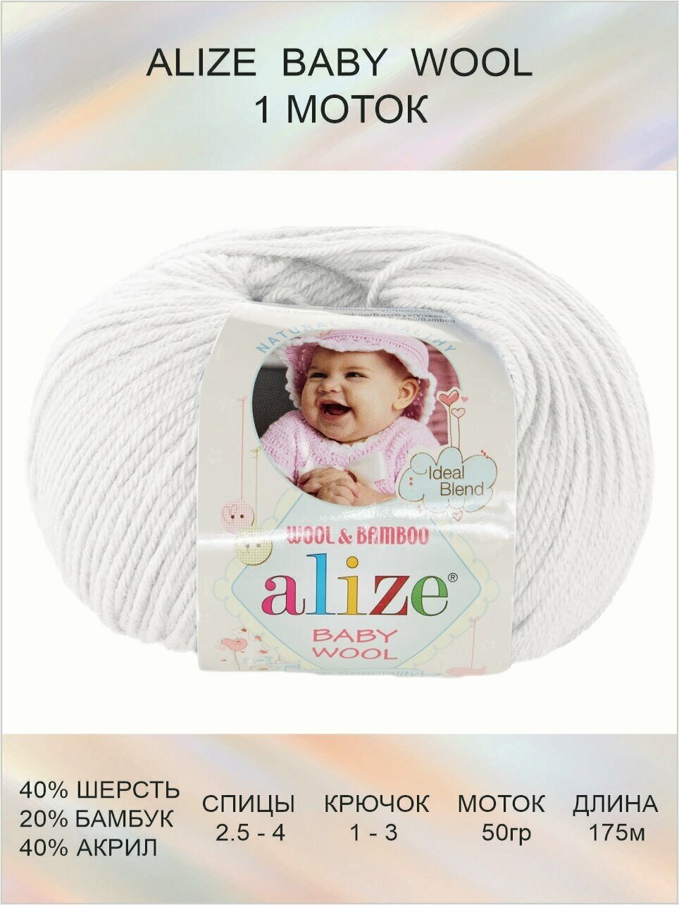 СохранитьПряжа для вязания ALIZE BABY WOOL Ализе Бэйби Вул Детская: 55 (белый) / 1 шт / 175 м / 50 г / 40% шерсть, 20% бамбук, 40% акрил интересное: