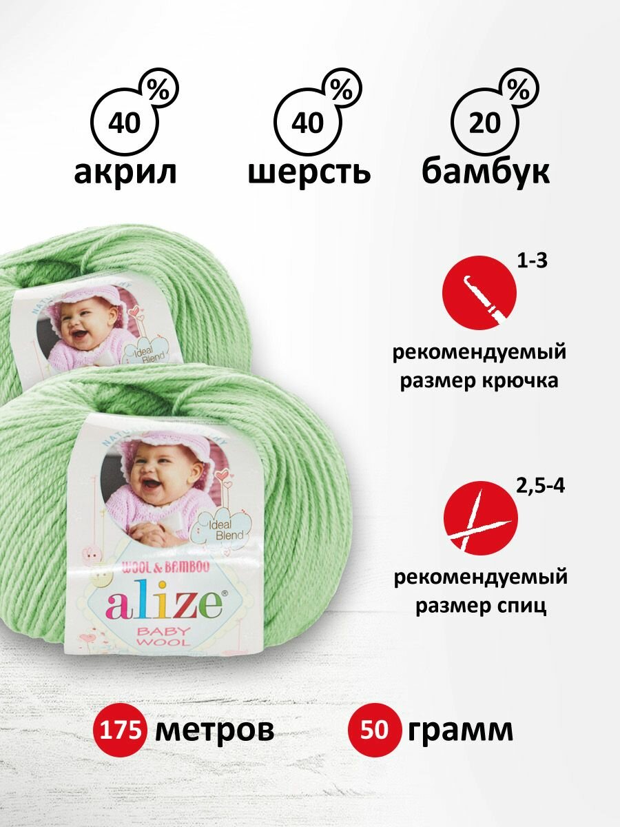 Пряжа для вязания ALIZE BABY WOOL Ализе Бэйби Вул Детская: 188 (зелёная мята) / 3 шт / 175 м / 50 г / 40% шерсть, 20% бамбук, 40% акрил