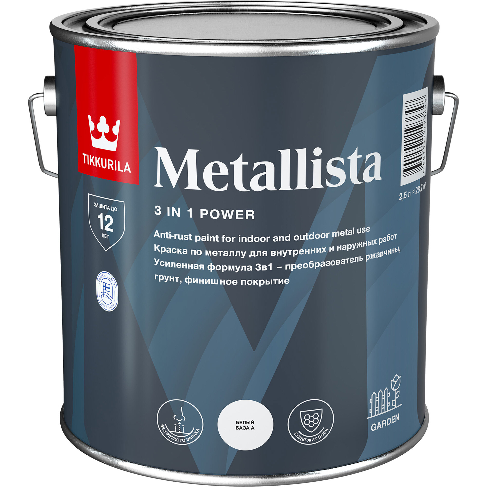Тиккурила Металлиста грунт-эмаль по ржавчине 3в1 глянцевая база A белая (2,3л) / TIKKURILA Metallista краска антикоррозионная глянцевая база А белая (