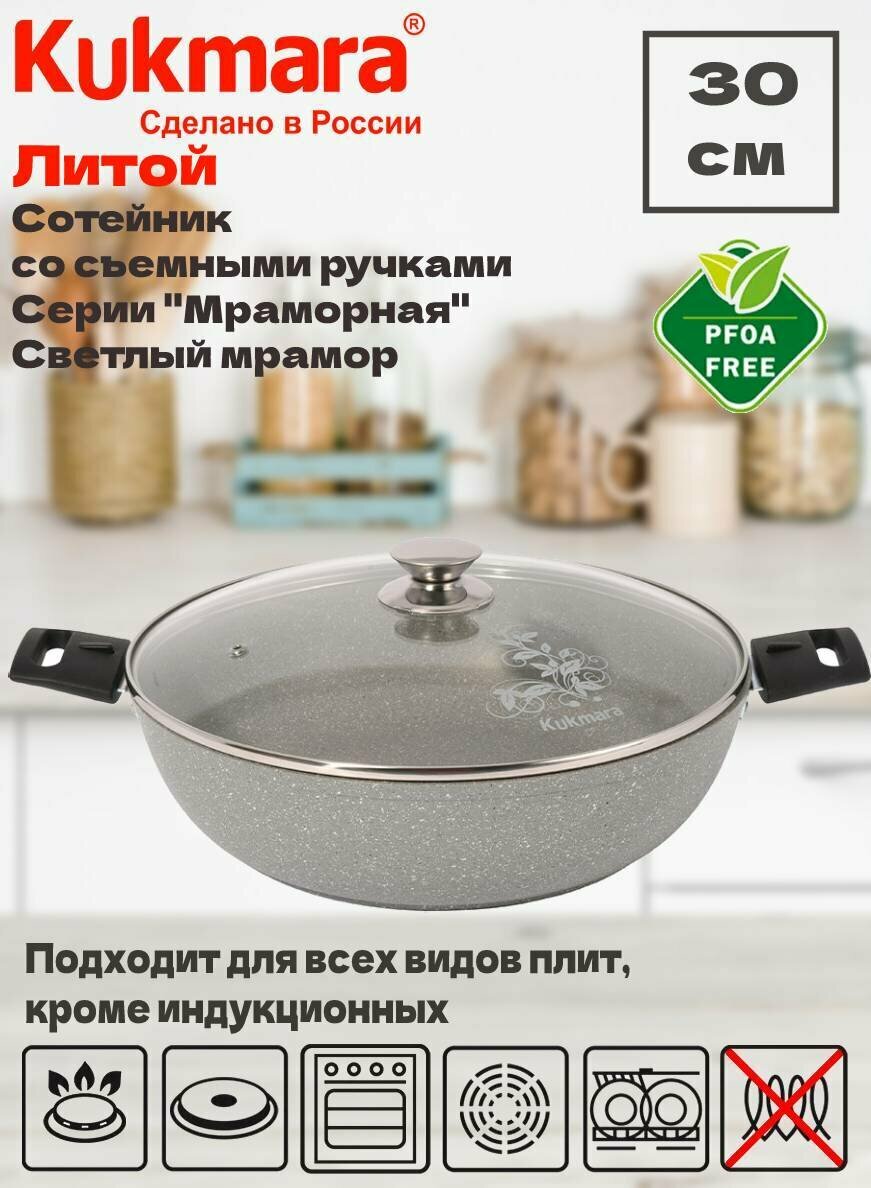 Сотейник со стеклянной крышкой со съемными ручками, Kukmara (Светлый мрамор) смс308а, 30 см